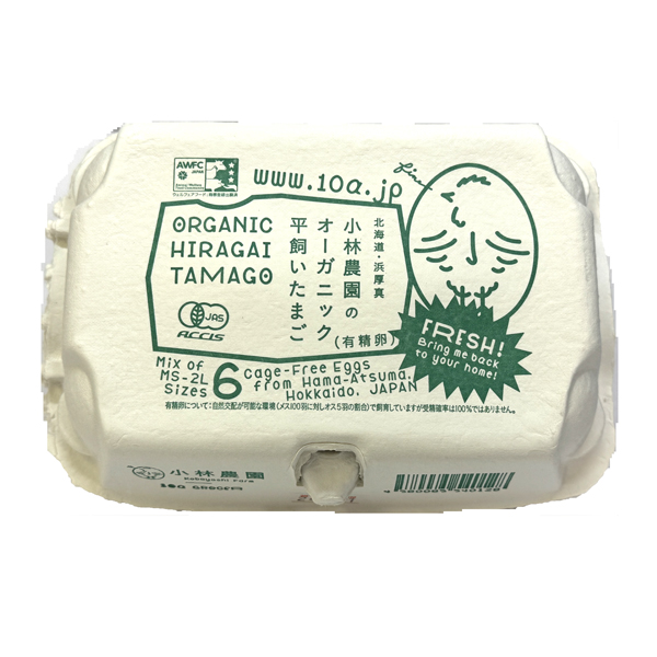 JAS有機認証を取得し、農薬や化学肥料不使用で、自然で健康的な選択肢です。「ケージフリー卵6個」の表示は人道的な飼育を強調。手塩にかけて育てられた高品質な卵で、北海道産という地域品質の証もあります。