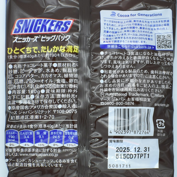 原材料:砂糖、ピーナッツ、水あめ、脱脂粉乳、ココアバター、カカオマス、植物油脂、乳糖、