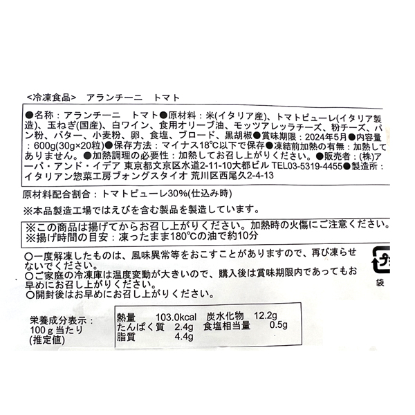 米、トマトピューレ、玉ねぎ、白ワイン、オリーブオイル、モッツァレラチーズ、粉チーズ、パン粉、バター、小麦粉、卵、食塩、ローリエ、黒胡椒