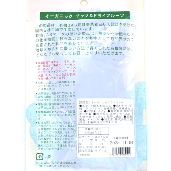 原材料:有機クランベリー、有機砂糖、有機植物油脂