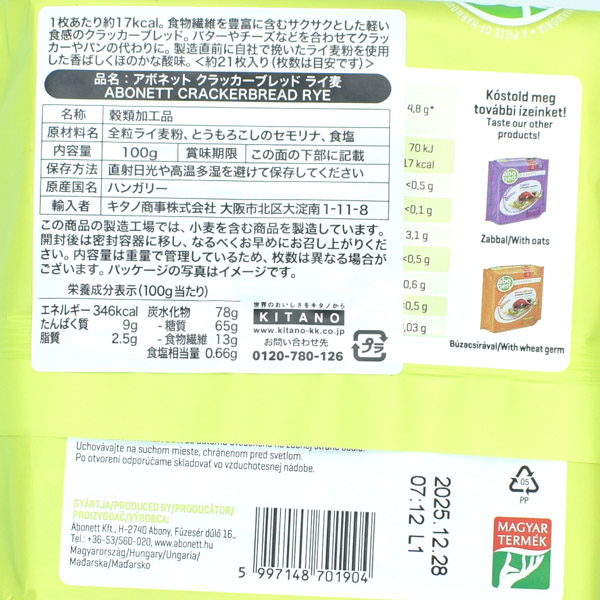 原材料:全粒ライ麦粉、とうもろこしのセモリナ、食塩
