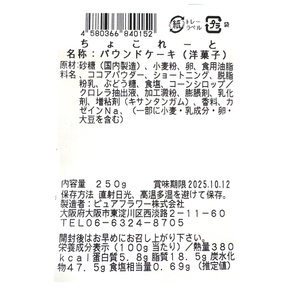 原材料:砂糖(国内製造)、小麦粉、卵、食用油脂、ココアパウダー、ショートニング、