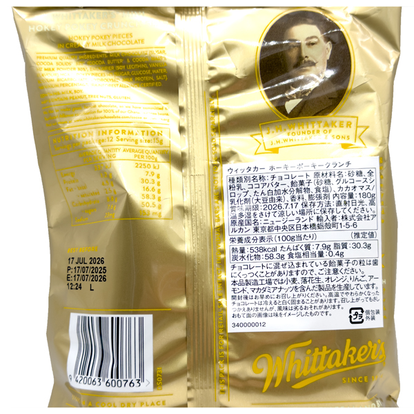 ニュージーランドを代表するチョコレートメーカー、ウィッタカーズから、人気のホーキーポーキーフレーバーです。