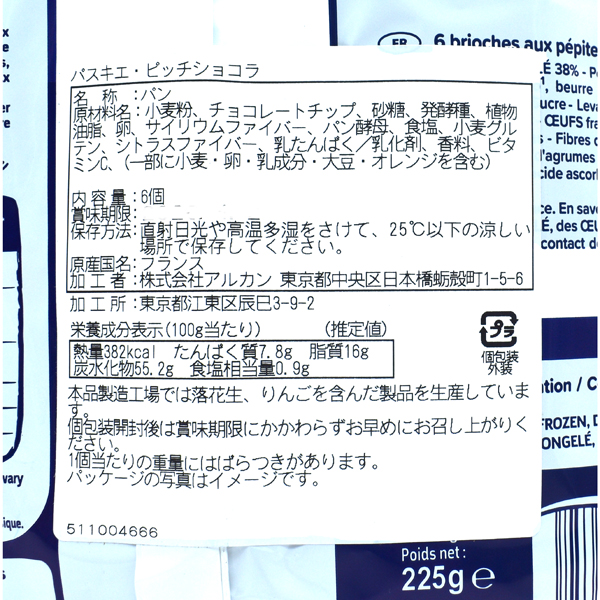 原材料:小麦粉、チョコレートチップ、砂糖、発酵種、植物油脂、卵、サイリウムファイバー、