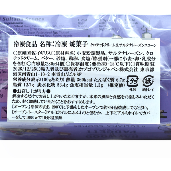 原材料:小麦粉調製品、サルタナレーズン、クロテッドクリーム、バター、砂糖、鶏卵、